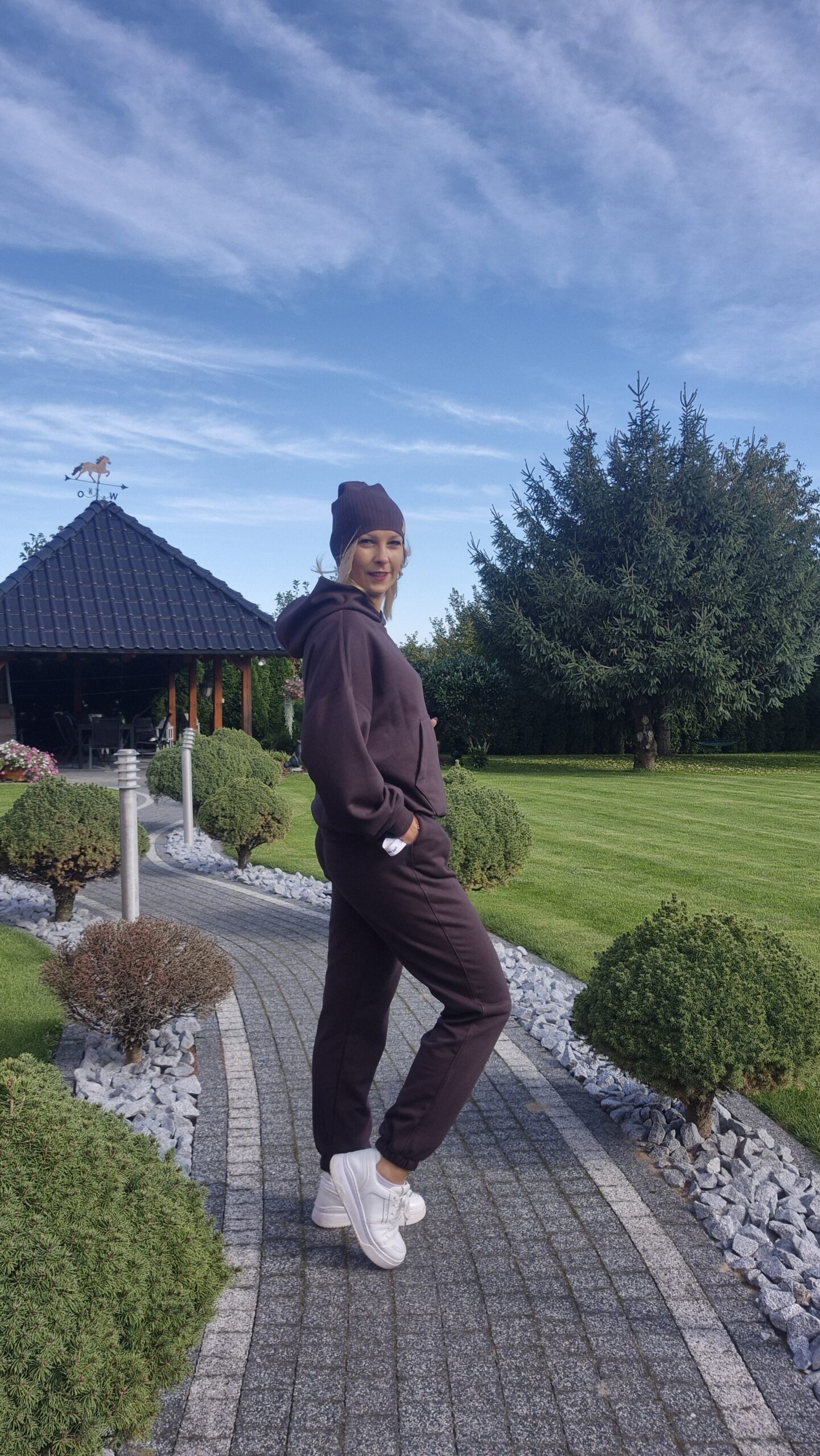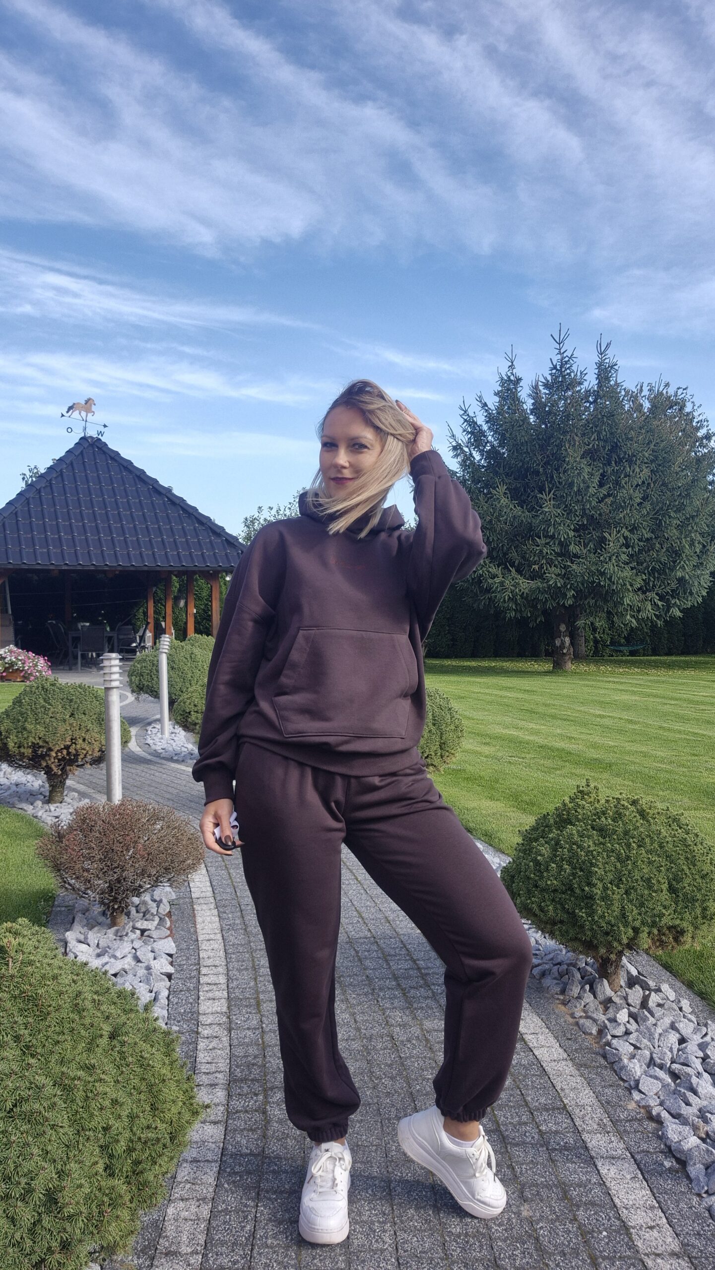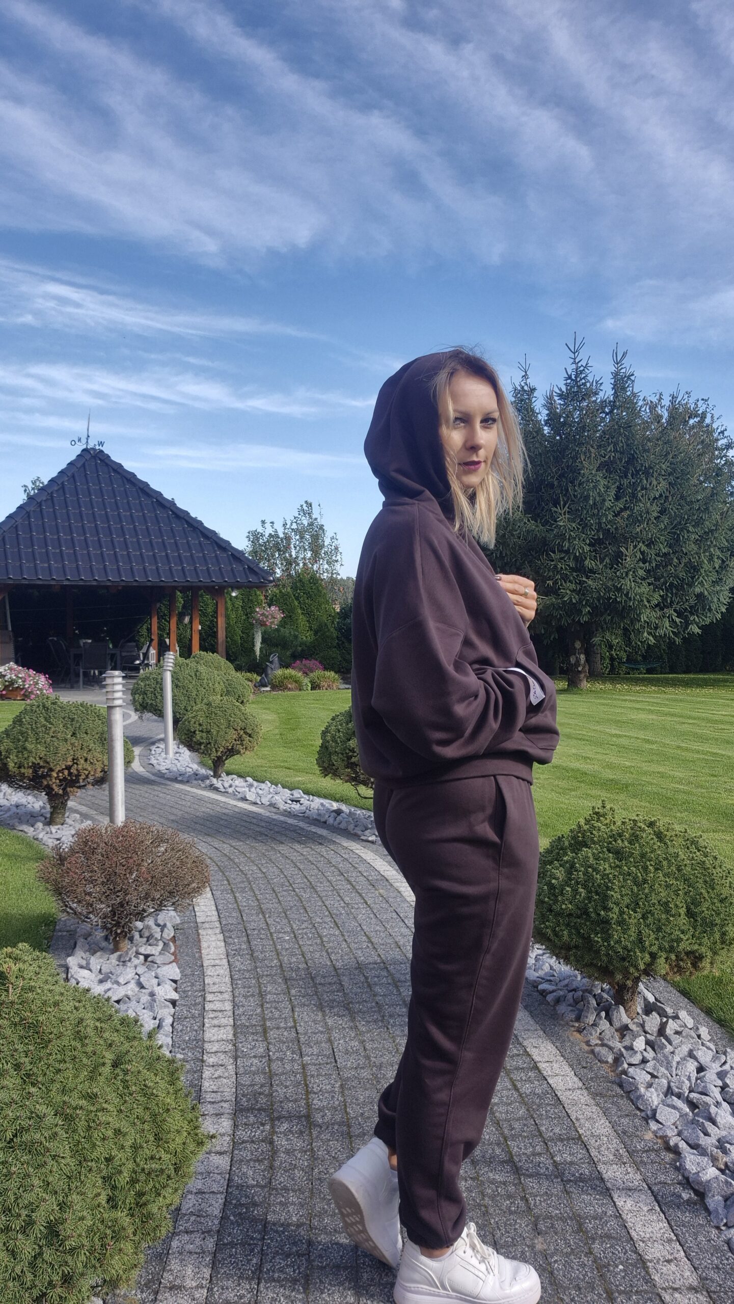 Stylowy dres damski o luźnym, swobodnym kroju, który łączy maksymalną wygodę z nowoczesnym, casualowym stylem. Zestaw składa się z luźnej bluzy z kapturem oraz spodni o prostym, komfortowym fasonie, tworząc idealną bazę do codziennych stylizacji.