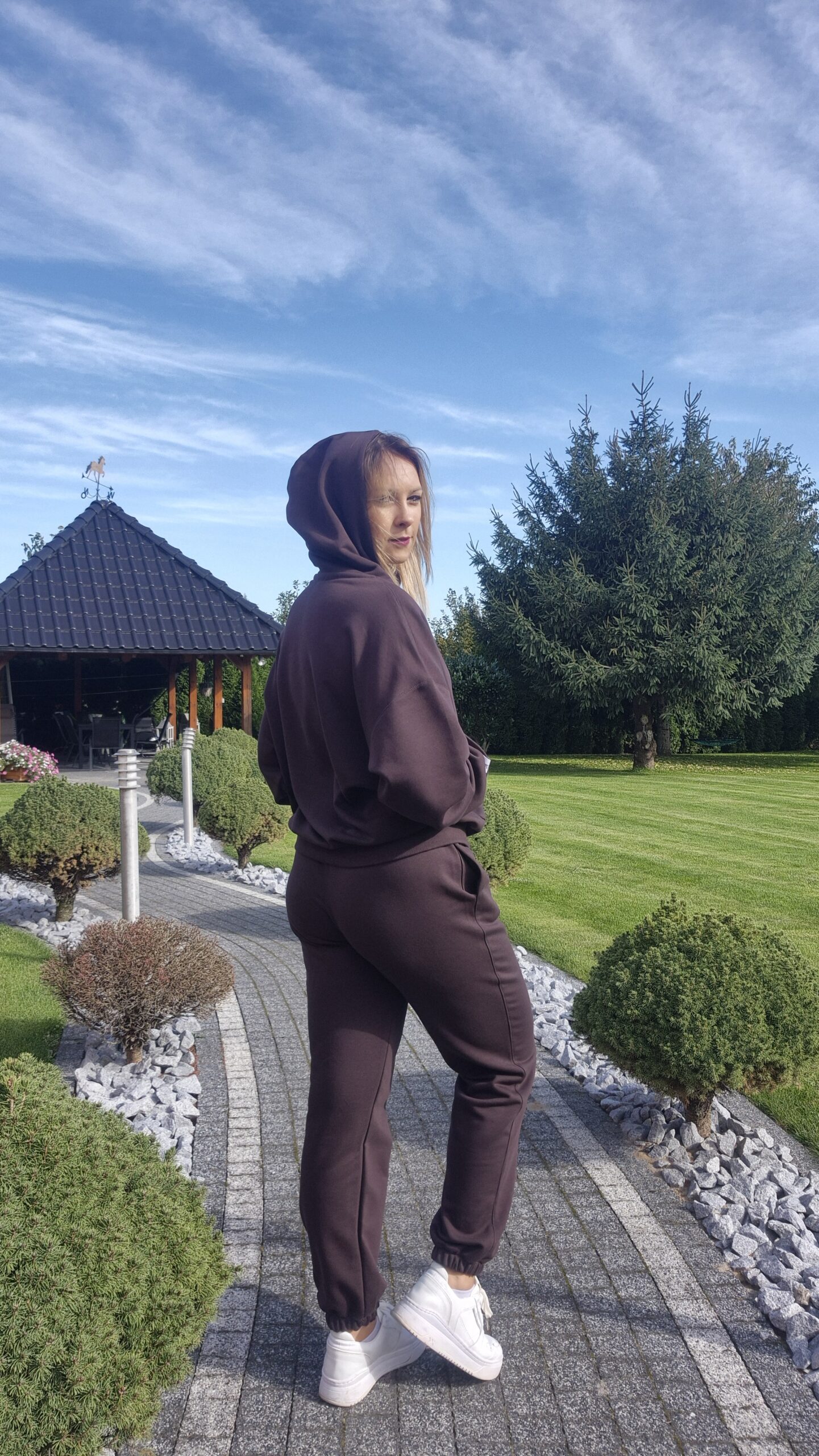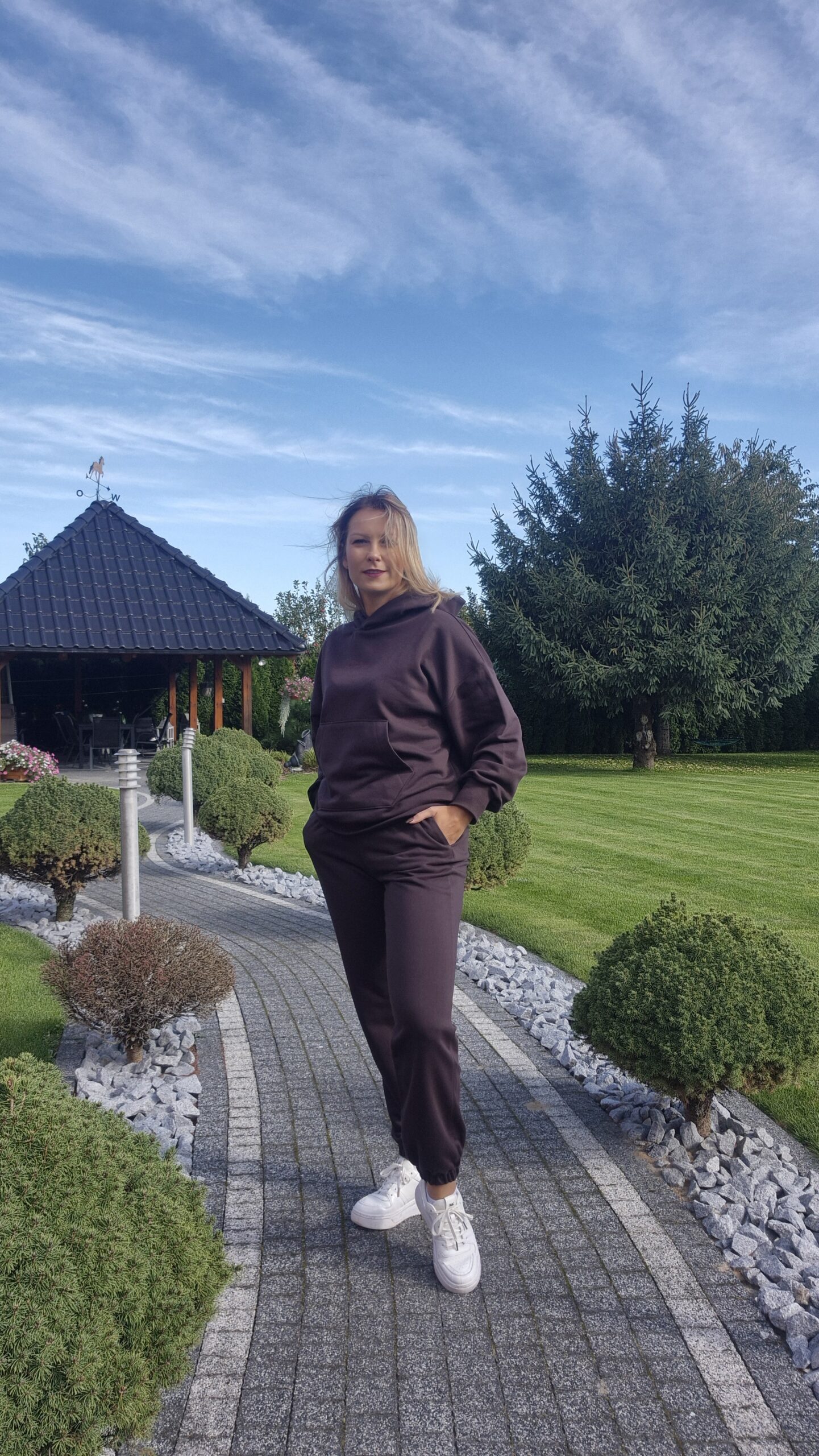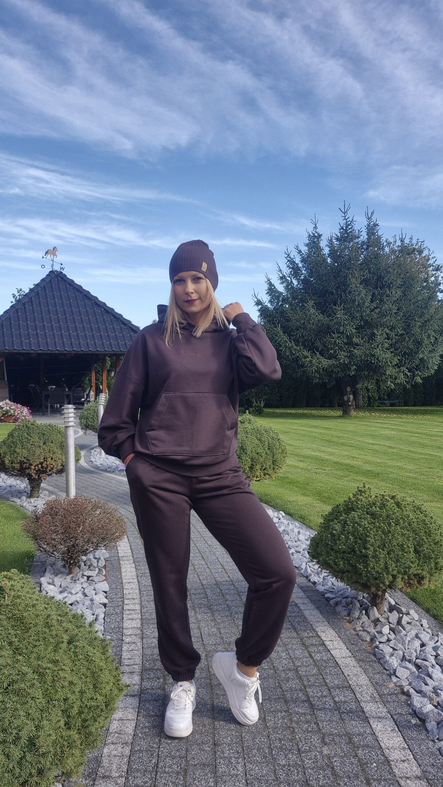 Stylowy dres damski o luźnym, swobodnym kroju, który łączy maksymalną wygodę z nowoczesnym, casualowym stylem. Zestaw składa się z luźnej bluzy z kapturem oraz spodni o prostym, komfortowym fasonie, tworząc idealną bazę do codziennych stylizacji.